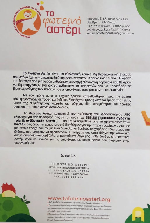 Φέτος το ABC for you με το χριστουγεννιάτικο παζαράκι του και πάντα με την βοήθεια των μαθητών μας και όσων μας τίμησαν και παρευρέθηκαν στην εκδήλωσή μας, στήριξε το Φωτεινό Αστέρι συγκεντρώνοντας το ποσό των 383,86 ευρώ. Σας ευχαριστούμε από καρδιάς και σας ευχόμαστε καλά Χριστούγεννα και καλή χρονιά!!
